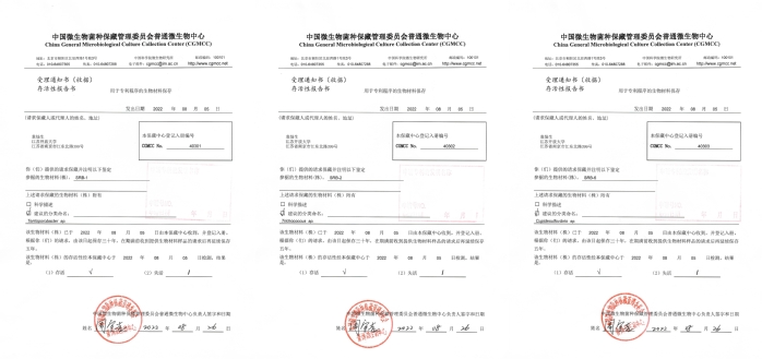 我院提供SRB-1、SRB-2、SRB-6三个菌株被中国微生物菌种保藏管理委员会普通微生物中心成功受理并登记入册。