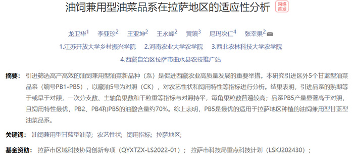 团队引进区外若干个甘油菜品系在拉萨地区种植,对农艺性状和饲用特性等指标进行了全面分析。通过数据分析,初步筛选到适合在拉萨地区作为油饲兼用型油菜种植的品系。后期将继续进行多年多点试验,为提高拉萨地区油菜产业发展提供基础性支撑。相关研究成果发表在《作物杂志》上(北大核心期刊,第一作者:龙卫华)。