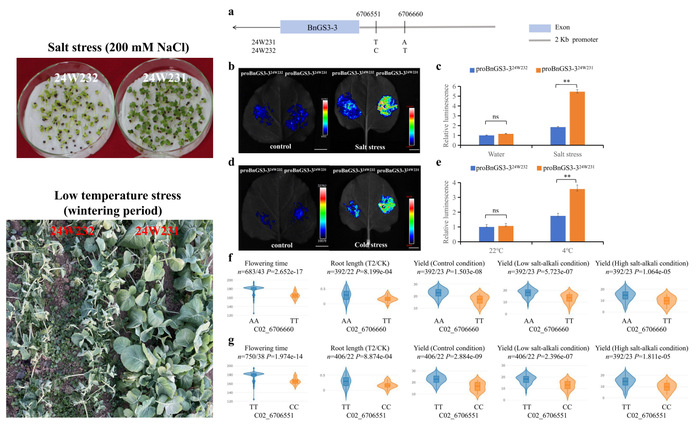 盐碱胁迫和冷害对油菜产量影响显著,而G蛋白在植物抗非生物胁迫中作用关键,但油菜G蛋白的研究尚处于起步阶段。团队研究发现BnGS3-3基因的启动子区域存在自然变异,并利用群体表型数据探究了该变异对开花时间、根长和产量的影响,为同步提高油菜耐盐性和耐冷提供了基因资源。相关研究成果(文章链接:https://doi.org/10.3390/plants14071145)发表在plants杂志上(中科院二区,第一作者:靳婷,通讯作者:龙卫华)。