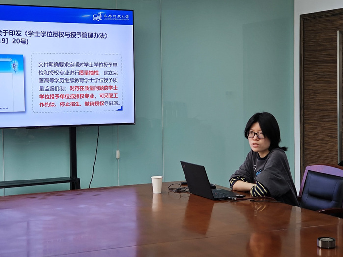 汪梦媛从指导文件与要求、审核流程与标准、材料撰写与准备、专家意见与建议四个方面具体就工作要求与细节层面开展辅导。她明确了审核流程的时间节点,指出要严格按照《江苏省学士学位授权专业审核标准》以及学校审核要求准备相应材料。针对评审过程中最重要的简况表、自评报告、支撑材料三个材料,她强调撰写评审材料时要体现政策导向、严格对照指标、凸显专业特色,并就材料中每一个分项进行了详细的阐述并提出了相应建议。最后,她根据以往专家普遍的意见进行举例说明,建议在撰写和筹备过程中吸取优秀经验,强化写作逻辑,提高材料质量。