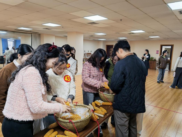 在趣味农耕劳动体验环节,老师们通过各种各样的方式搓动手中的玉米棒,在劳动中体验着丰收的快乐。